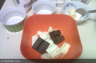 On August 1, 2012 by Meghalee DasThere are some recipes which require a lot of precision and alertness because a few extra seconds can change the texture of the dish. Choco lava or molten lava cake consists of a deceptively simple recipe but it has a tendency to either become too moist or too dry. Hence the baking time has to be monitored closely as it can be different from oven to oven and I could bake a perfect lava cake only in my third attempt. I read a few recipes available online and originally made it for Valentine’s Day this year as I thought the decadent, rich cake would be perfect for a romantic evening. But when I cut it there was no molten chocolate inside! The second time I followed another recipe which even insisted using a water bath but the bottom of the cake was not baked, so the chocolate oozed out as soon as I turned the ramekin! *Groan*. I almost gave up but thought of trying it one last time, and made some changes in the baking time but kept the ingredients same. I made enough for just two persons and it turned out great! I would suggest that you bake it one ramekin at a time to get an idea of what temperature and time is ideal for your oven, so that way you don’t waste the entire batch of batter.