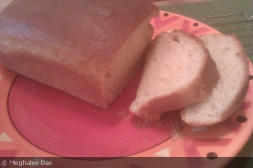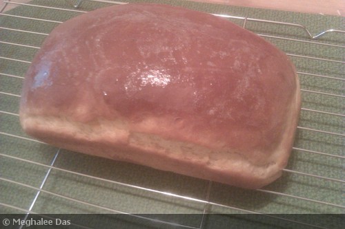 On July 23, 2012 by Meghalee DasThis is a simple recipe for making plain white bread. I have used all-purpose flour instead of bread flour, and no eggs. The texture of this bread is very soft and it is best eaten warm and fresh. I have also added whole wheat flour along with all purpose flour but you can use only plain flour if you like white bread.
