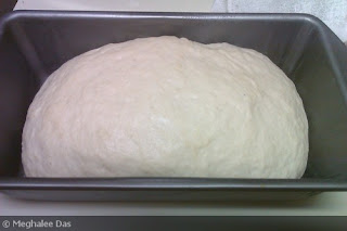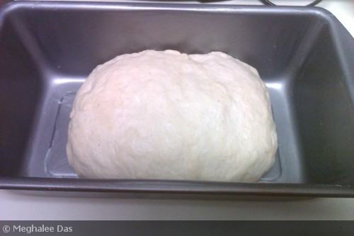 5) Once the dough has sufficiently rise, punch it and knead it again with some flour till it is smooth. Shape the dough by tucking the ends under the loaf, like an envelope, and place it in a greased loaf pan.