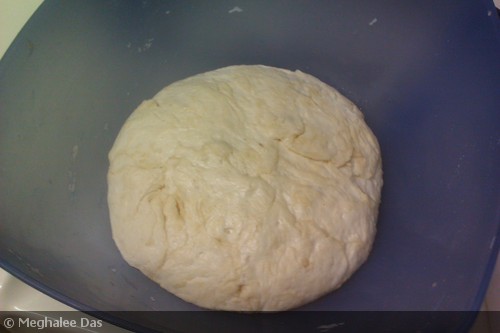 4) Place it in a greased bowl, turn it around so that the grease coats the whole dough and cover it with a damp towel or plastic wrap. Keep aside for 1 hour or till it doubles in size.