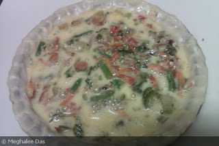* Prepared pie crust, either bought from the market or that you already baked: Place the cream cheese pieces, sauted vegetables on the prepared crust and pour the egg and cream mixture on it.